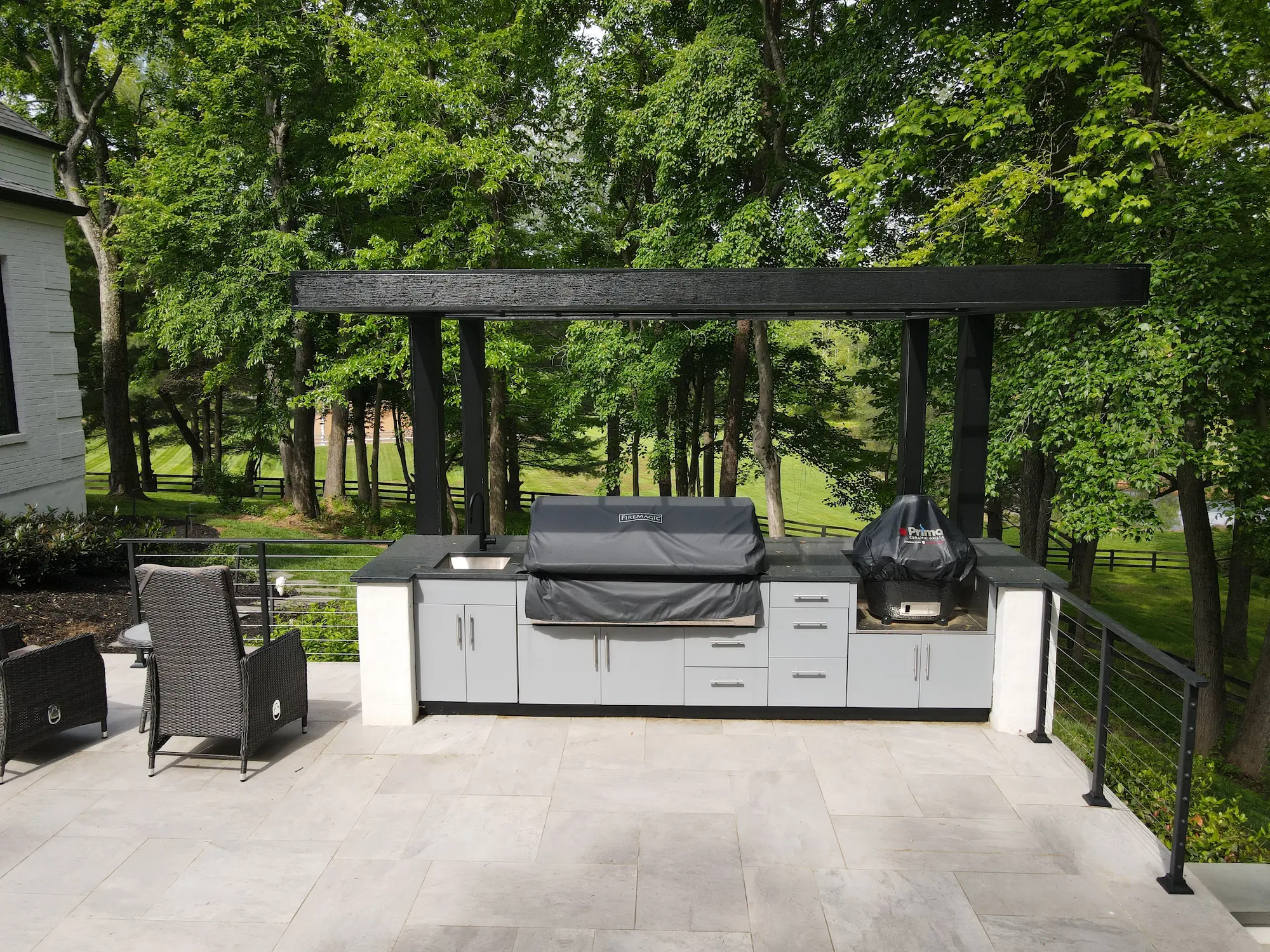 We introduced strong architectural lines through expansive stone terraces, a refined pool and spa layout, and a fully integrated outdoor kitchen. Structured plantings, clean edging, and layered greenery soften the hardscape while reinforcing the home’s contemporary aesthetic.
