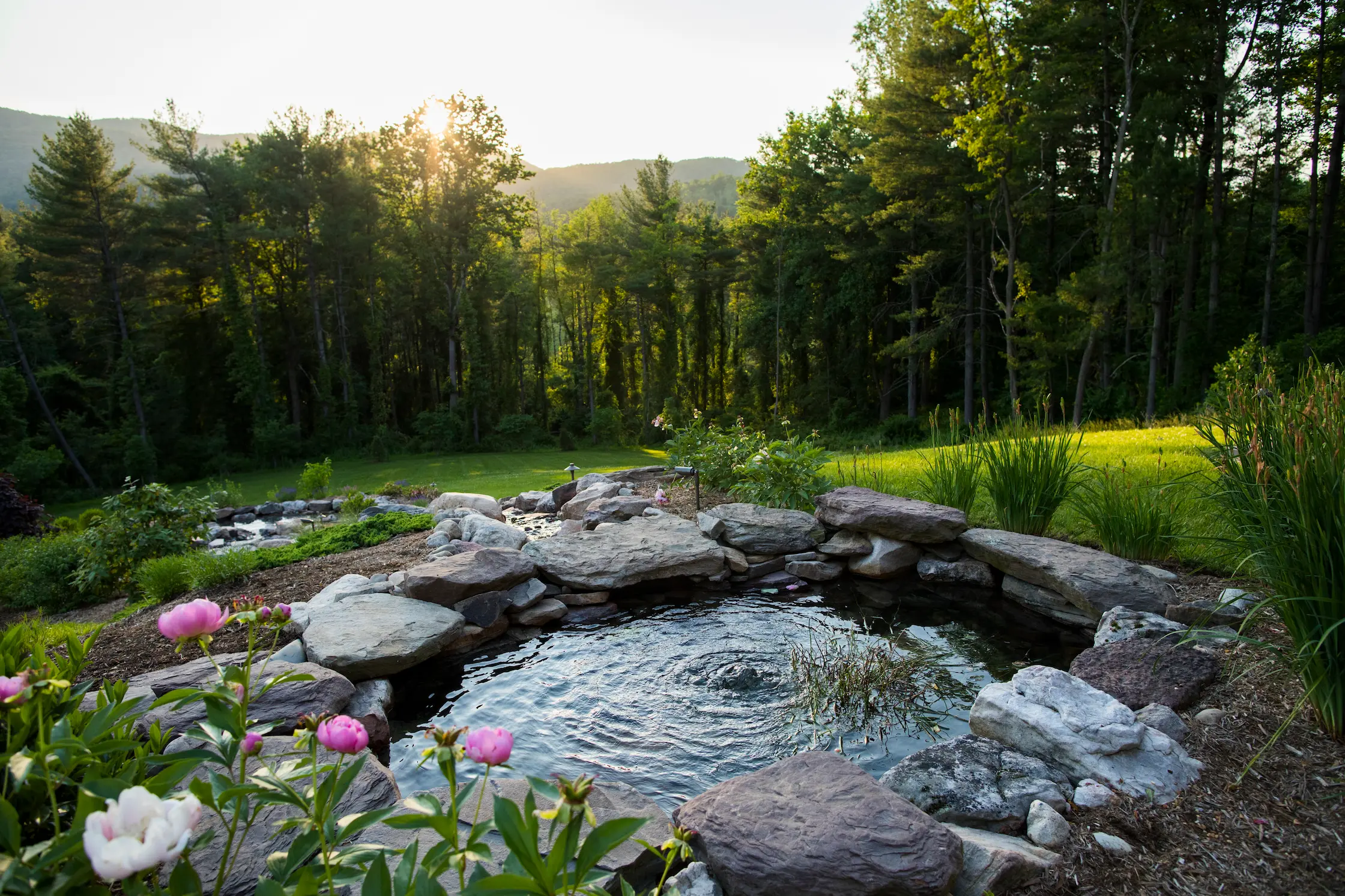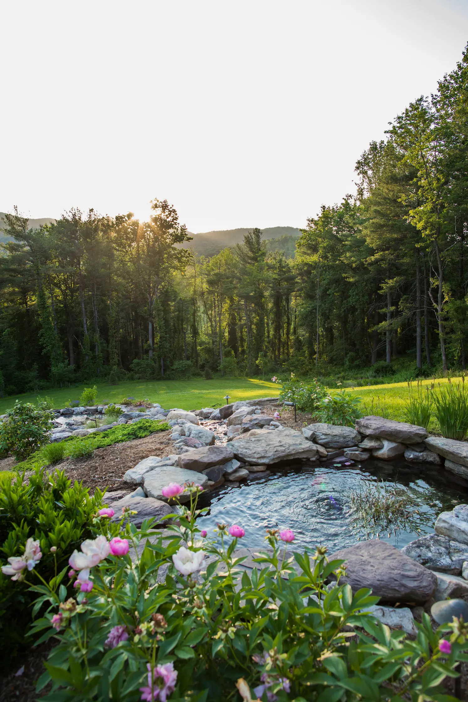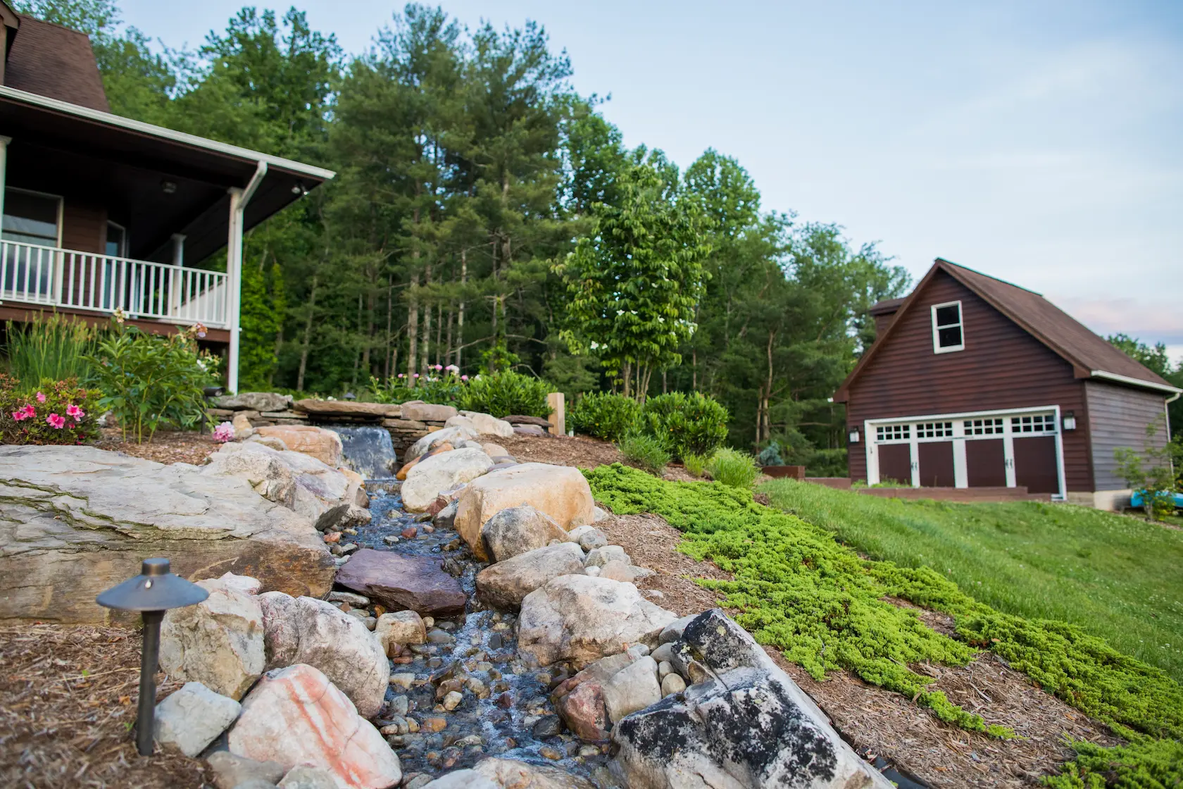 We approached the site as both a destination and a system. In the rear yard, the breakthrough was realizing the deck could extend fully to the hillside—creating room for a clean transition with a seat wall and terrace edge. We built a retaining wall to hold the slope, extended and reinforced the existing deck framing, then shaped the grade to support the focal point: a cascading water feature designed to feel like a natural, spring-fed pond.