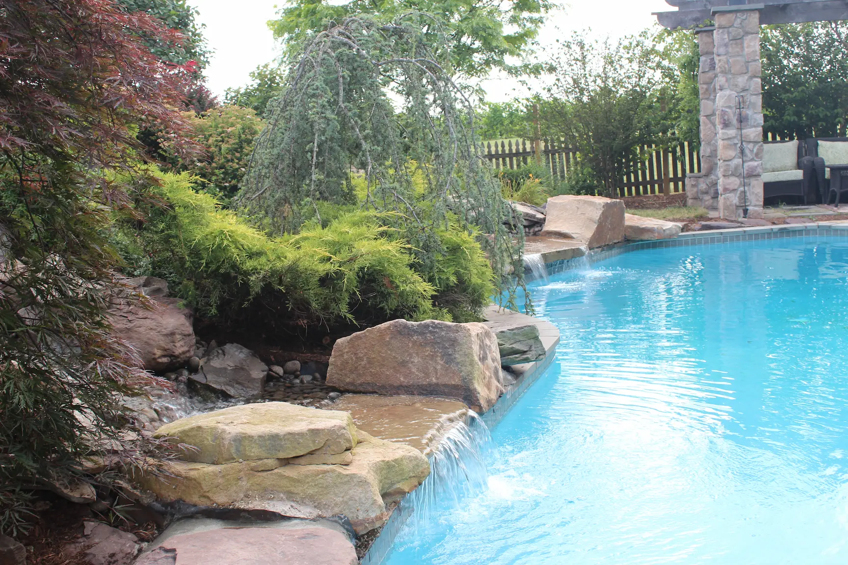 We designed a layered, resort-inspired environment that blended stone, water, and planting into a cohesive whole. Natural boulders, custom waterfalls, and a pergola structure were carefully positioned to frame views, soften hard edges, and create a seamless transition between architecture and landscape.